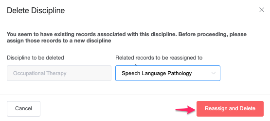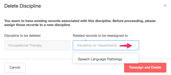- Notice that a Delete Discipline modal will appear. This prompts you to assign the current Practitioner records to another existing discipline before deleting them.