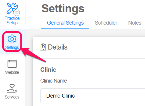 - Start by clicking on the Settings tab located under Clinic Setup menu.