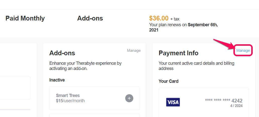 How can I update my billing/credit card information to pay for my Therabyte subscription?