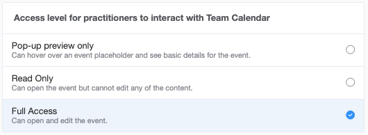 First, choose how much calendar access each practitioner has. Then, choose how they can interact with those events.