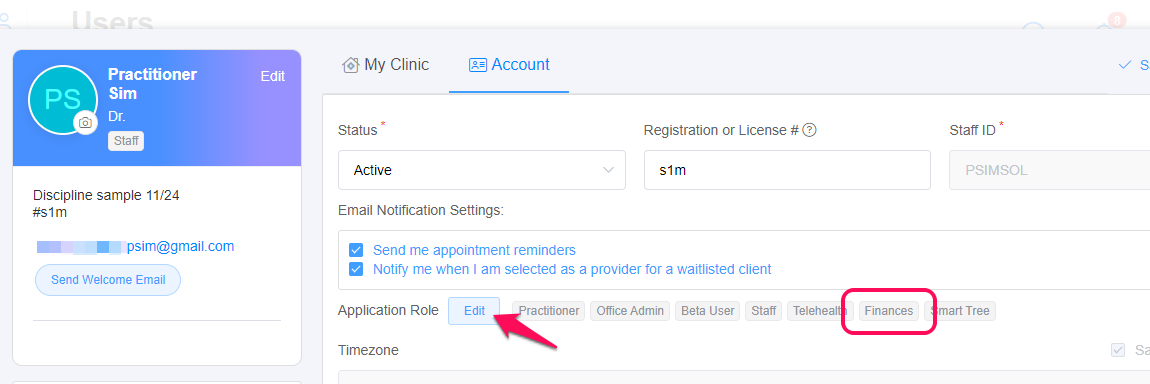In this example, we will be removing the Finances role from the Practitioner. Click the Edit button to make changes to the assigned roles.
