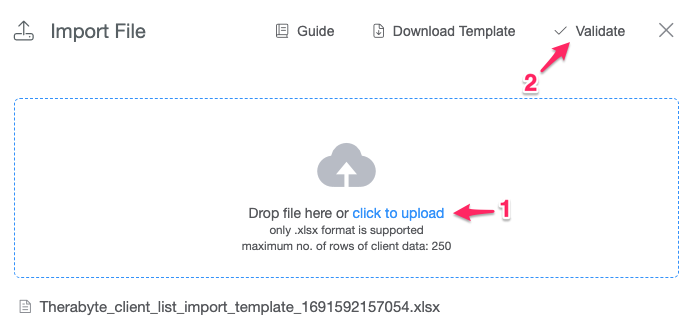 - Upload the file and click Validate.
