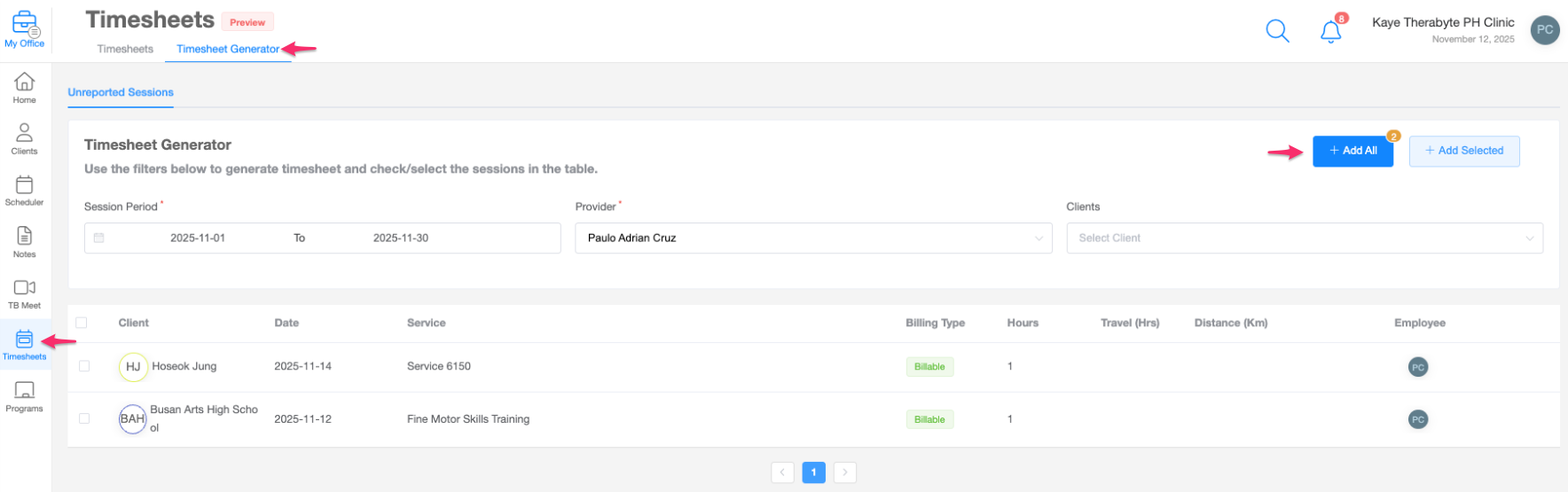 - Select individual clients or click Add All to include all sessions within the chosen period.