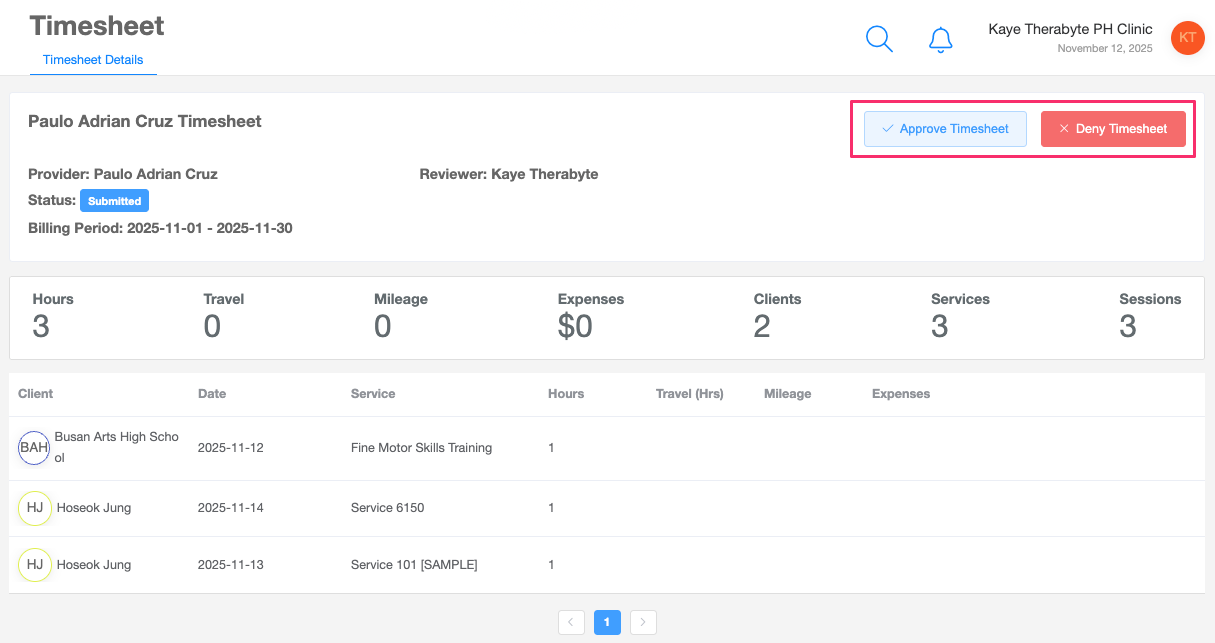 - Admins/Owners: Review, approve, or deny submitted timesheets and manage payroll and invoicing.