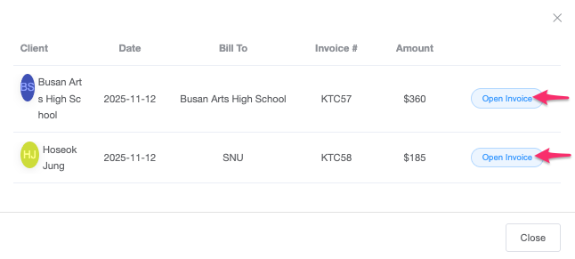 Click on the timesheet you’d like to review to see all associated sessions and amounts.
