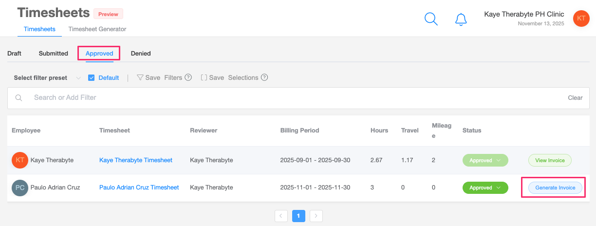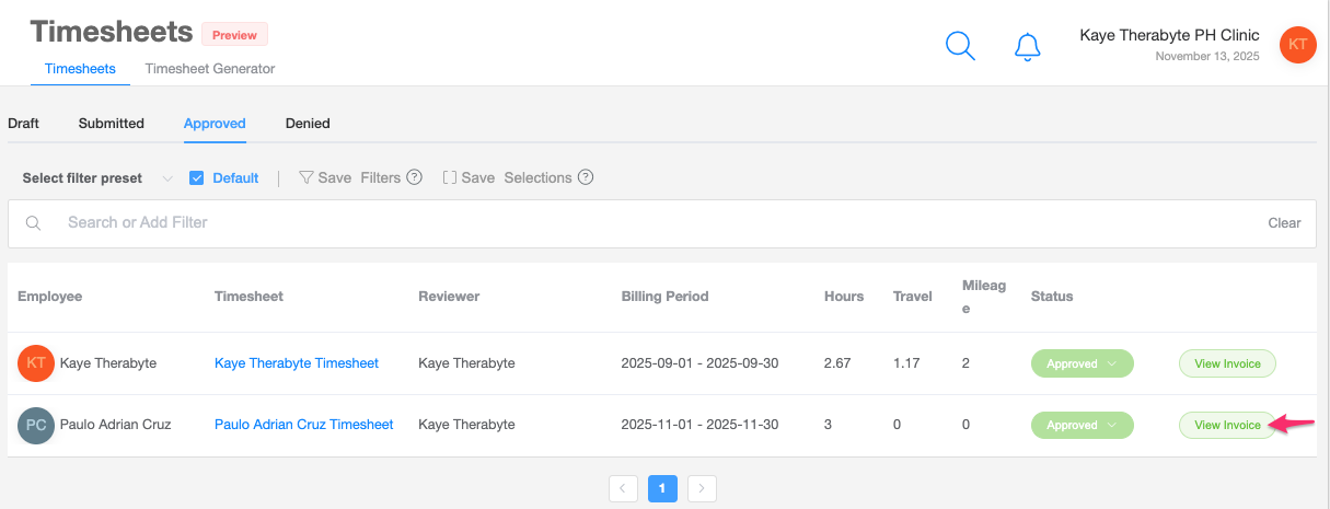 Once approved, the timesheet moves to the Approved section where invoices can be generated.